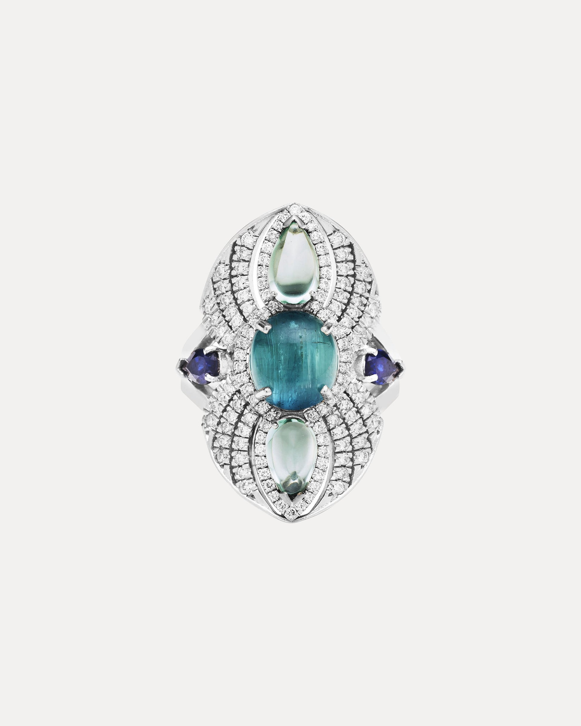 bespoke 18ct white gold maddison cat's eye blue tourmaline, sapphire & diamond ring