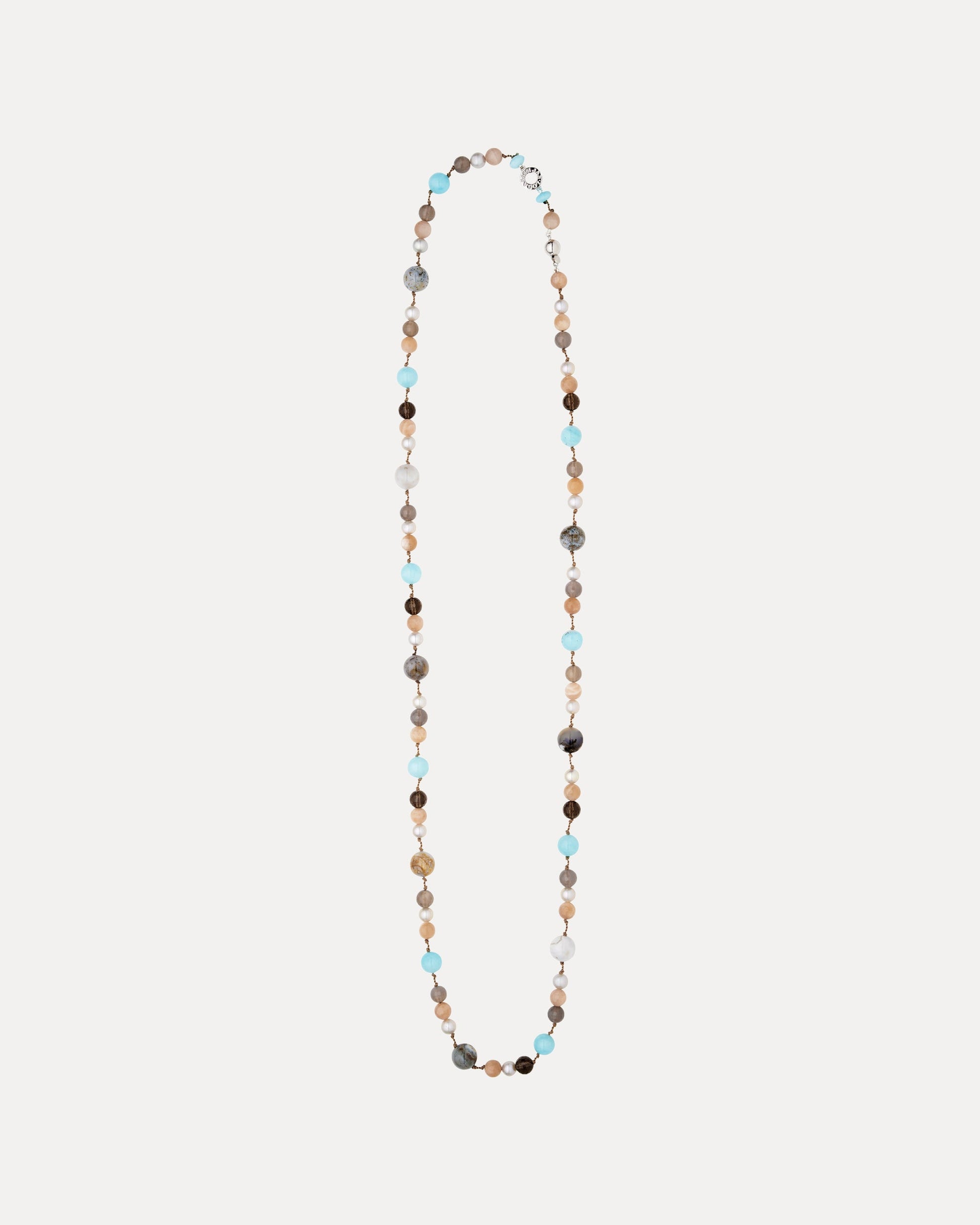 - This 90cm flapper consists of aquamarine, moonstone, ocean jasper, pearl and smoky quartz.