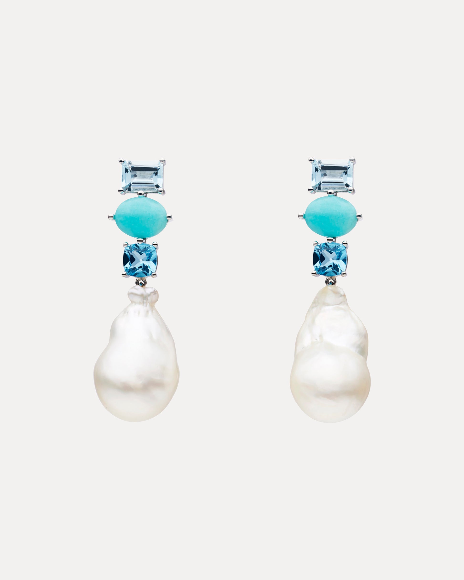 - Earrings are approximately 50mm in length and consist of aquamarine, amazonite, topaz and baroque South Sea pearls.