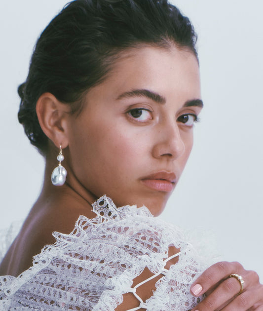 Model and influencer Dominique Elissa epitomised timeless elegance on her wedding day, wearing our 9ct Baroque & Round Pearl Aniston Earrings. These earrings feature a harmonious blend of classic round pearls and unique baroque pearls, embodying both tradition and individuality. JAN LOGAN is honoured to have been part of such a special occasion, with the Aniston Earrings symbolising the brand's commitment to crafting jewellery that enhances life's most cherished moments.