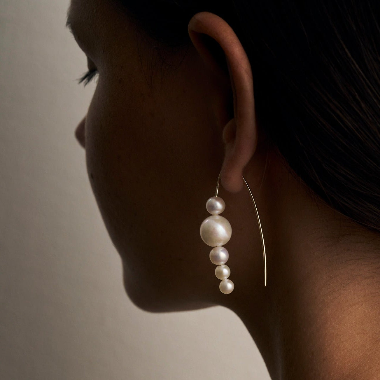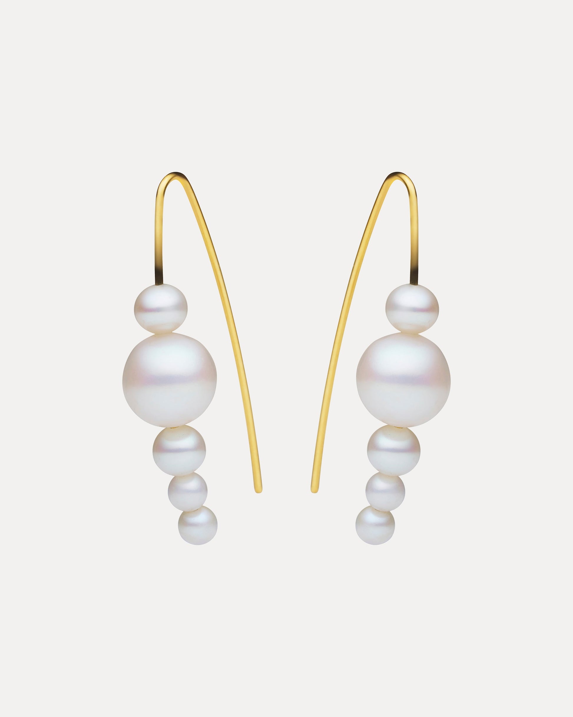- The earrings feature freshwater pearls in an asymmetric graduating style, ranging from 10.5mm down to 4mm round